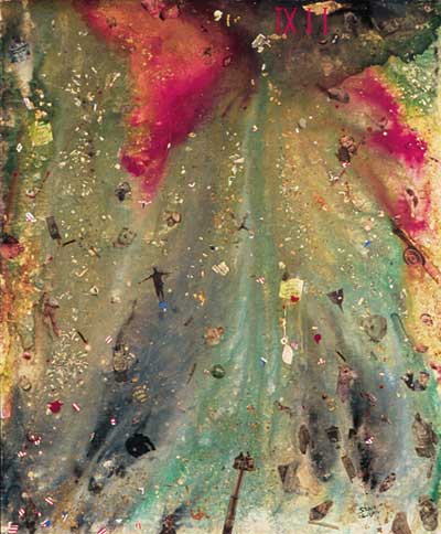 Chod Stine has been a professional artist for more than 25 years. His collectors are international. He is both a painter and a sculptor. His style is vast and various, ranging from classic portraiture, to photo realism, to abstract expressionism. Chod currently lives in Key West, Florida where his art can be seen almost everywhere, in banks, public buildings, murals, city transit busses, art galleries and cigar shops. A variety of Chod's is for sale, along with commissions and portraits. Immediately after the September 11th attacks on the United States I was tuned into the television set and watched the news around the clock. I collected every piece of printed material I could get my hands on including magazines and newspapers. I began this painting the day after the terrorist attacks. My daughter Kit, had been asking me to teach her about composition of artwork and asked me if she could help. I gave her twenty-four karat gold leaf and paper currency to shred into small pieces. I instructed her to cut out peoples personal items such as a child�s baby doll, cell phones and shoes, as I began working on the background of the piece. I wanted the painting to have a dual effect: an emotional abstract appeal at a distance and a contrasting intellectual statement when viewed up close. The background was created by applying several colors of raw pigment to a water soaked board, then tilted at different angles to create a cataclysmic looking effect. When the pigment dried, the painting was varnished. We then began to apply the selected images. Some of the photos and shredded currency were burned at the edges by lit cigarettes, and when the ashes fell to the painting it added a positive effect. After all the images were applied the piece was covered with several coats of varnish so it is indestructible. Therefore it need not be covered in glass and can be cleaned. The end result when viewed from a few yards away strikes the viewer as a volcano of cool earth tones and grays rising to a plume of warm shades of red and golds. The perception of the image is soothing and non-threatening to enjoy. However, when viewed up close, something else unfolds. Falling down from the red and golds are shattered pieces of money, gold, office supplies, pictures of shoes, clothing, shredded stars and strips, post-it notes saying, �Soccer game 6:00 call home� and �lunch 1:30 Ann�, cell phones, computers and small camels cut out of boxes of Camel cigarettes. Rising from the center of the bottom of the painting is a ladder rising from a fire truck with two silhouettes of people on top. In October2001, I displayed the piece in a vacant storefront window on the 500 block of Duval Street, Key West, FL for four weeks. After I removed the painting from the window, people I did not know heard about the painting by word of mouth and came to my house inquiring about the piece they heard about and saw. The original painting of 9-1-1 (40"x48") is now on display at the Key West Museum of Art & History at the Customs House, 281 Front Street, Key West, Florida. I titled the name of this painting �9-1-1� pronounced like the emergency call telephone number. The asking price of �9-1-1� is $21,000. This does not include shipping.